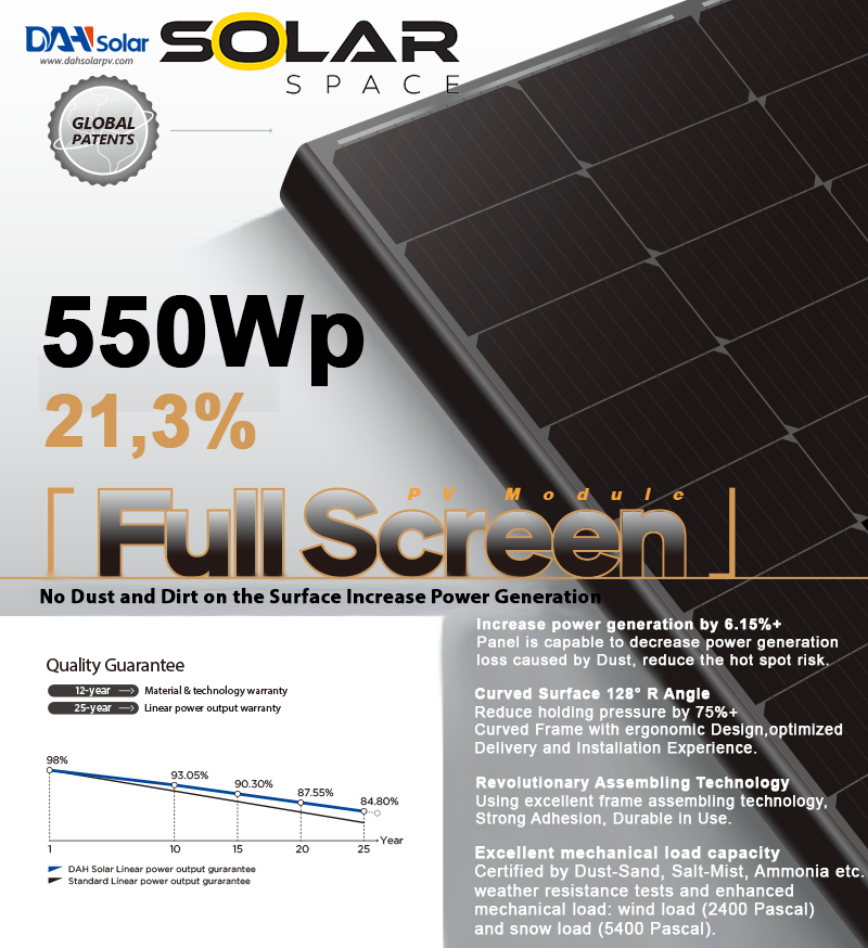 Prémiové celočierne bezrámové monokryštalické solárne panely DHM-72X10-FS sa vďaka svojej konštrukcii pýši vysokou účinnosťou až 21,3%, mechanickým zaťažením až 5400 PA a zvýšenou odolnosťou voči teplotným výkyvom. Patentovaná bezrámová technológia zvyšuje dlhodobý výkon až o 15%.