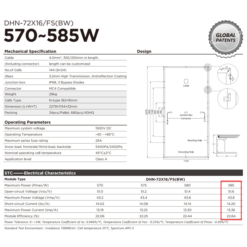 Datasheet k solárnym panelom DAH Solar 585Wp, Full Screen, Black Frame