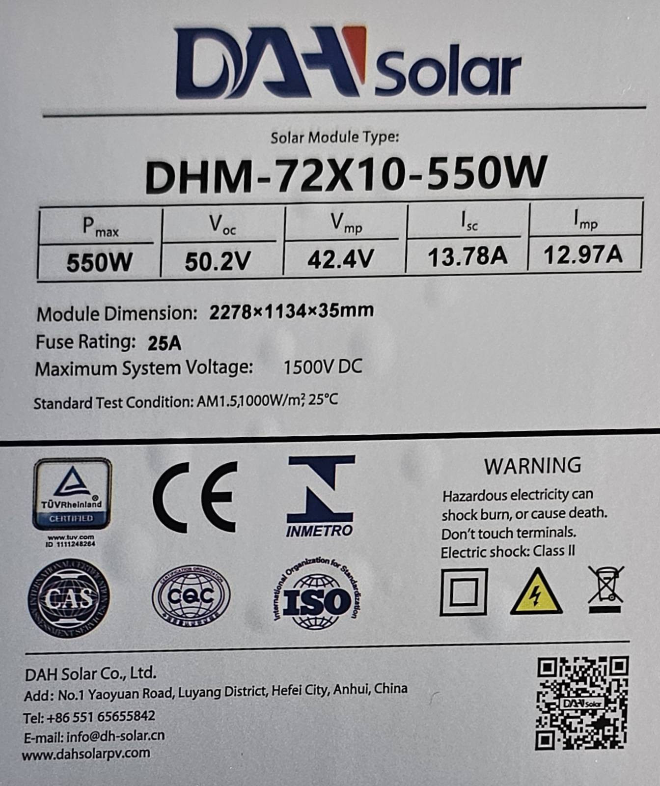 Špičkové monokryštalické solárne panely DHM72X10 od spoločnosti DAH Solar (Tier 1 podľa Bloomberg) sa vďaka svojej konštrukcii pýši vysokou účinnosťou až 21,3%, mechanickým zaťažením až 5400 PA a zvýšenou odolnosťou voči teplotným výkyvom. Jednotlivé desaťzbernicové (10BB) half-cell články rozširujú svetlo-absorpčnou plochu a maximalizujú výkon modulu aj pri difúznym svetle (vysoká miera oblačnosti), čo ich robí ideálnymi pre inštalácie, kde je potrebné maximálneho výkonu na obmedzenom priestore.
