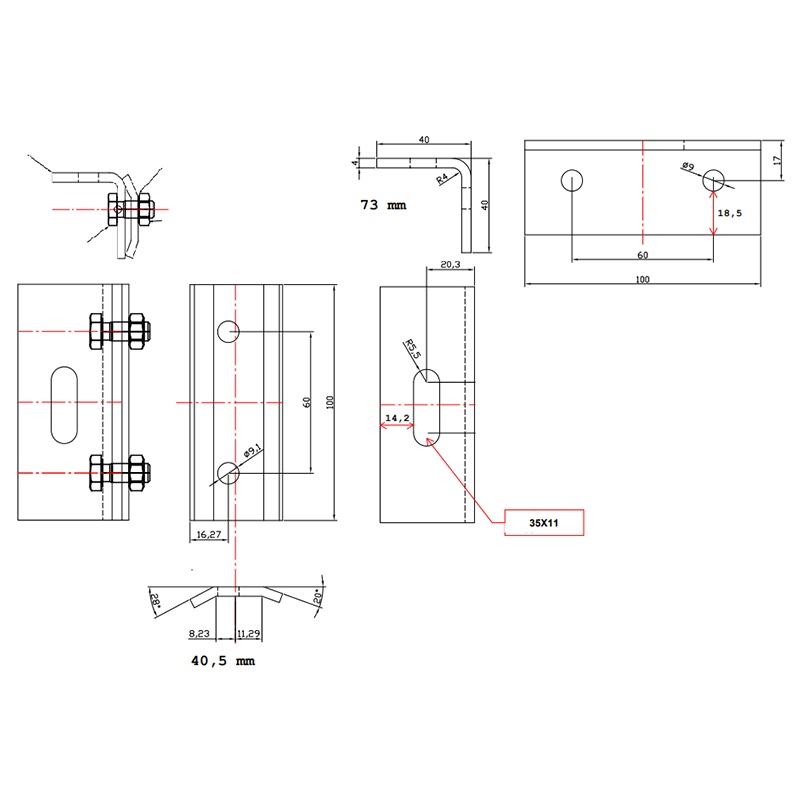 Hrúbka materiálu 4 mm. Rozmery 50 x 50 x 110 mm - drážka 30 mm - M10.