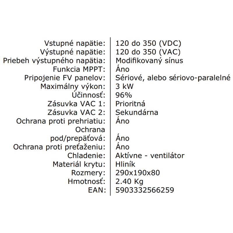 | Menovité výstupné napätie (V) | 120 do 350 (VAC) |